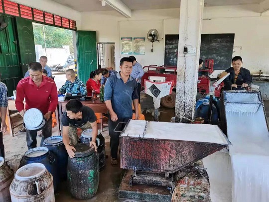 在龍江分公司雄英2隊(duì)收膠站,膠農(nóng)們前來賣膠水。袁國華 攝